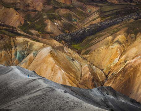 Нас ждет несложный подъем на вершину вулкана Блаухнюкюр, откуда открывается потрясающий вид на долину Ландманналёйгар. После спуска с Блаухнюкур нас ждет горячая ванна посреди исландских гор: из-под лавового поля Лёйгахрёйн вытекают холодные и горячие потоки воды и смешиваются, создавая подходящую температуру для хорошей расслабляющей процедуры.