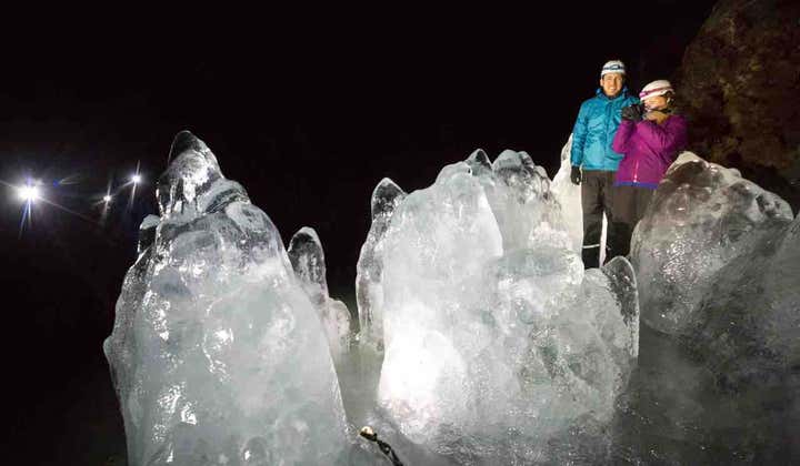 The tour starts from Lake Mývatn area, the journey to the cave leads you through rugged tracks along incredible geology. The Drive leads you past the volcano Mt. Hverfjall and along Lúdentarborgir crater row. Once we reach the roots of Mt.Hvannfell there is a 30 min Guided hike across the lava fields to the entrance of Lofthellir cave. There you will be provided with a helmet, headlamp and studded boots for better grip, inside this Ice Cave.